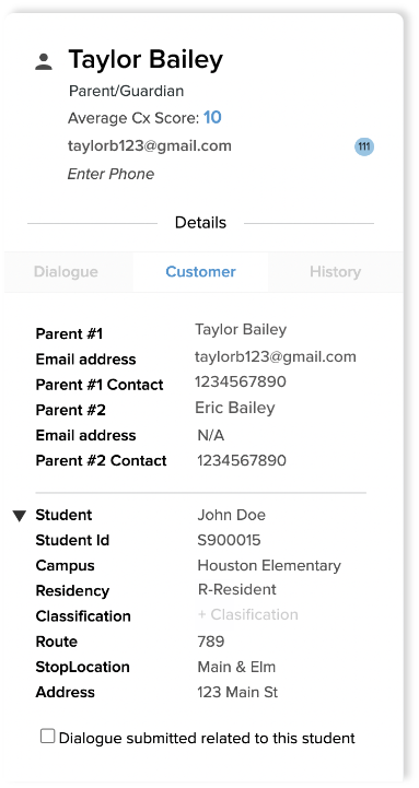 Student information is synched to parent phone numbers and emails so customer profile data like student bus routes appears on-screen whenever communications come in.