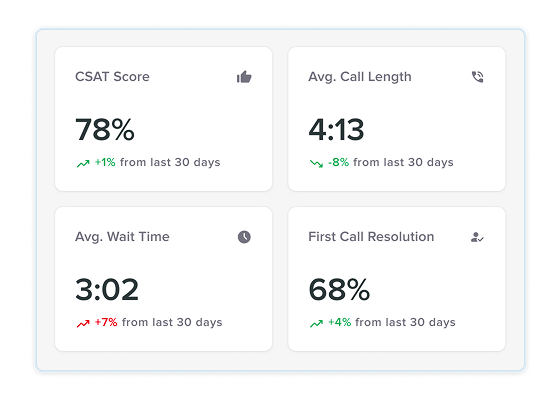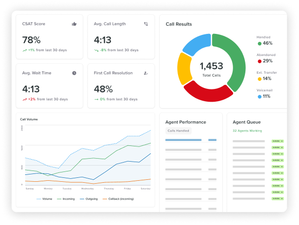 Track key metrics like call volume, wait time, resolution time, and agent performance with custom dashboards and reports