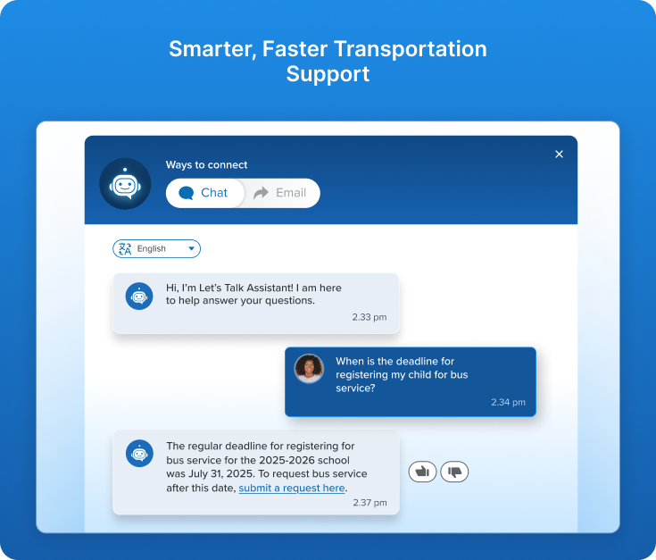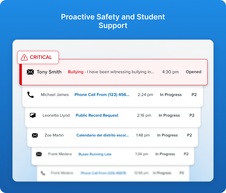 From bus delays to lost items, simplify parent access and resolve issues faster. Use AI chatbots, automated routing, and multi-channel tracking to handle everything from routine questions to safety concerns.
